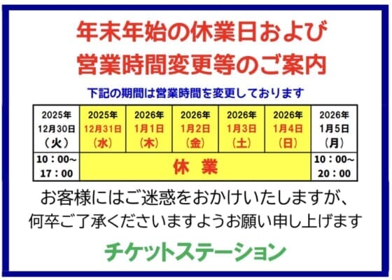 2025年 12/26(金) ~ 2026年 1/5(月) となります!!!
